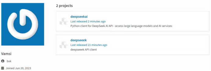 2025 年 1 月 29 日,用戶(hù) bvk(該賬戶(hù)于 2023 年 6 月創(chuàng)建,且無(wú)其他活動(dòng)記錄)在 Python 軟件包索引(PyPI)上傳了兩個(gè)軟件包:“deepseeek”和“deepseekai”。