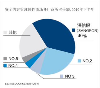 深信服科技在IDC中國發(fā)布的2009年下半年中國安全內(nèi)容管理市場(上網(wǎng)行為管理市場)報告中占有率達(dá)到33.8%,超出第二位廠商達(dá)一倍多。